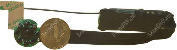 Объектив камеры расположен на 80 мм шлейфе, с обратной стороны которого расположен управляющий модуль камеры 55х15х3 мм. Таким образом вперед Вы можете вытащить лишь объектив, а управляющий блок спрятать. На фото Вы можете увидеть размер камеры в сравнении с 10 рублевой монетой для оценки размеров камеры и, соответственно, возможных мест установки еще до покупки!